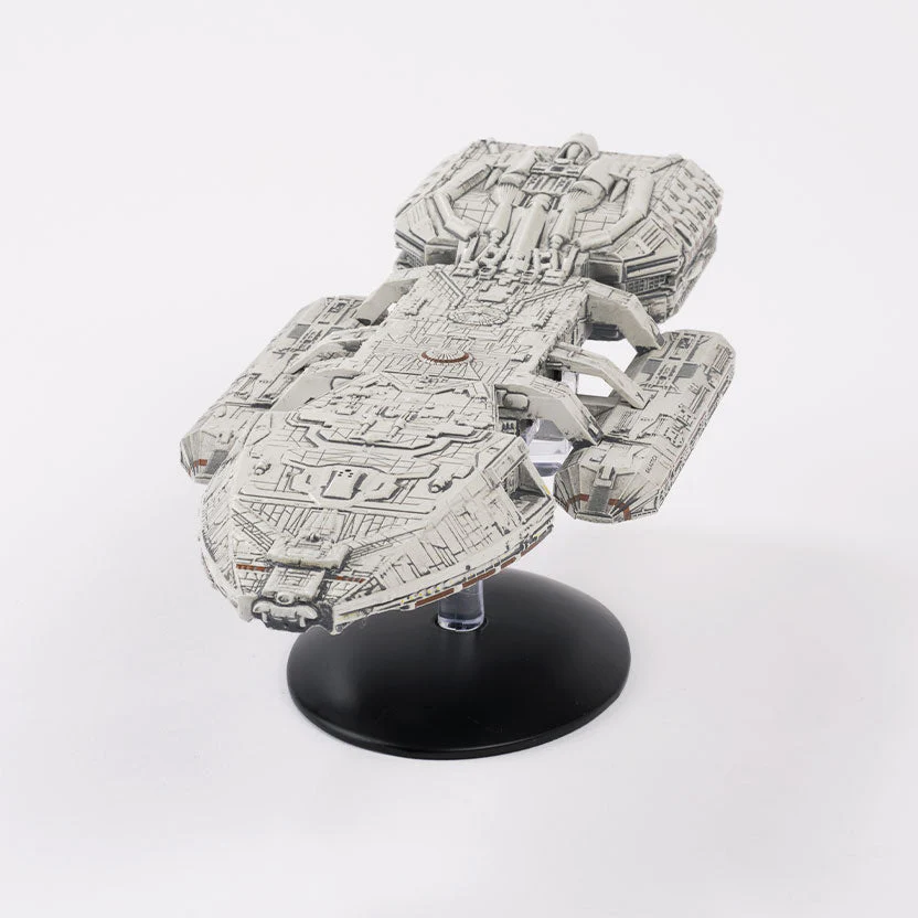In the original 1978 show, the Battlestar Galactica was an advanced vessel that led the Colonial fleet. It had a crew of 500 and carried 75 vipers. The ship was designed by concept artist Ralph McQuarrie who started on the new TV show after working on Star Wars. The brief was to create an aircraft carrier and he gave the ship twin pods on outriggers that provided the vipers with a runway they could land on. The model is just over 10.5 inches (27 cm) long.