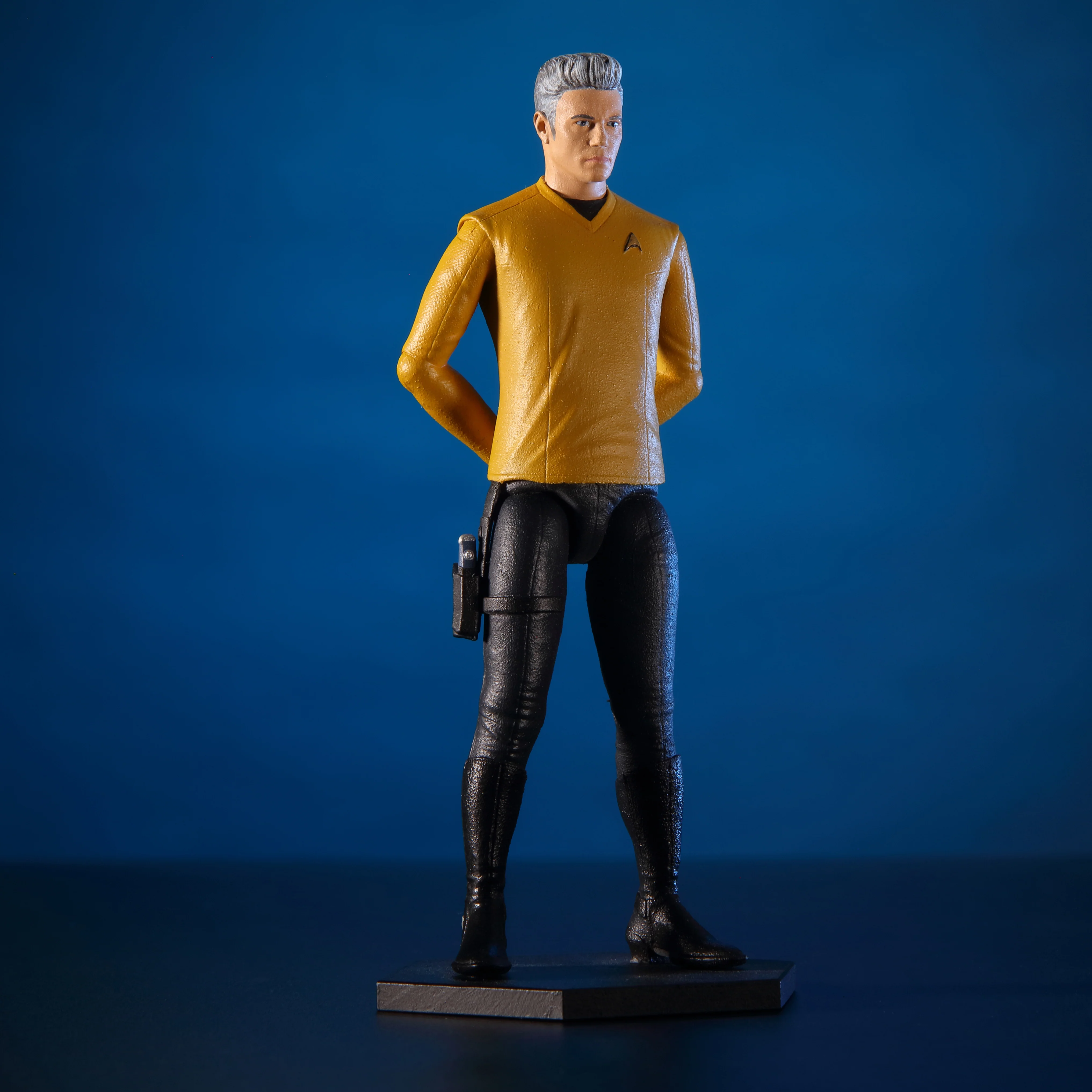 "This action figure shows Captain Christopher Pike as he was when he commanded the U.S.S. Enterprise NCC-1701 in the late 2250s – the era covered by Star Trek: Strange New Worlds. He is wearing the standard captain’s tunic; the gold color indicates that he is in the command division. He comes with a phaser pistol, a phaser rifle, and a communicator.