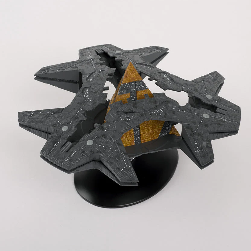 One of the most iconic designs in the history of Stargate. The Goa'uld used Ha'tak motherships to impose their will on the Galaxy. These vast ships resembled giant, spaceborne pyramids and were equipped with fearsome firepower. After the fall of the Goa'uld they were operated by the Free Jaffa. This is one of a limited number of Stargate models produced by Eaglemoss. it measures 8 inches (20 cm) wide.