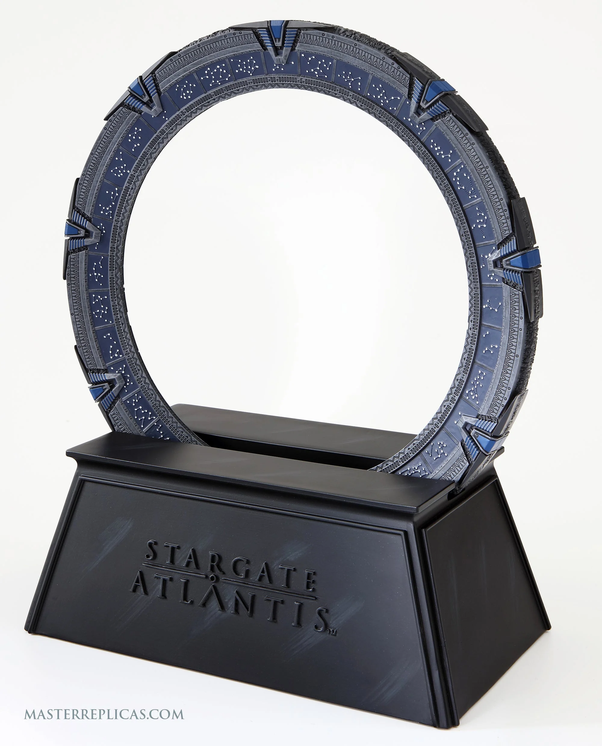 The replica gate measures 9.25 inches (23.5 cm) across. It is made of polystone and comes with a separate display base that carries the Stargate Atlantis logo. Master Replicas has carefully reproduced every glyph on the gate, which was based on a digital model that was supplied by MGM.
