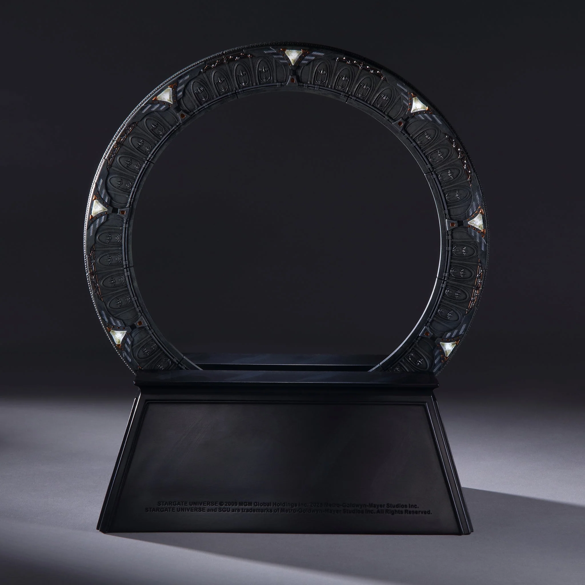 The replica gate measures 9.25 inches (23.5 cm) across. It is made of polystone and comes with a separate display base that carries the SGU logo. Master Replicas has carefully reproduced every glyph on the gate, which was based on a digital model that was supplied by MGM.